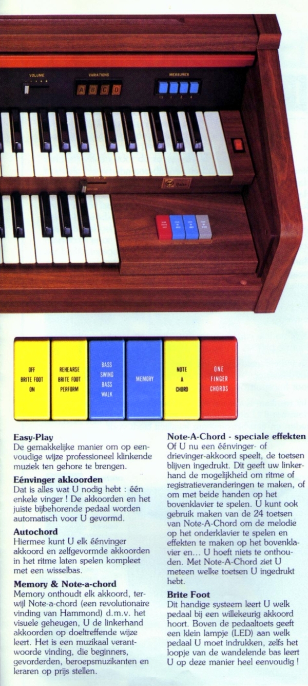 De prijs in 1980 was echt niet laag te noemen, maar daarvoor kreeg je wel een bijna complete drawbargroep op het onderklavier. De Leslie was uiteraard mechanisch en had een strak kanaal voor de solo-stemmen, w.o de piano.