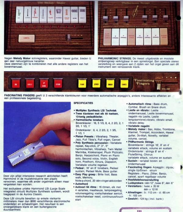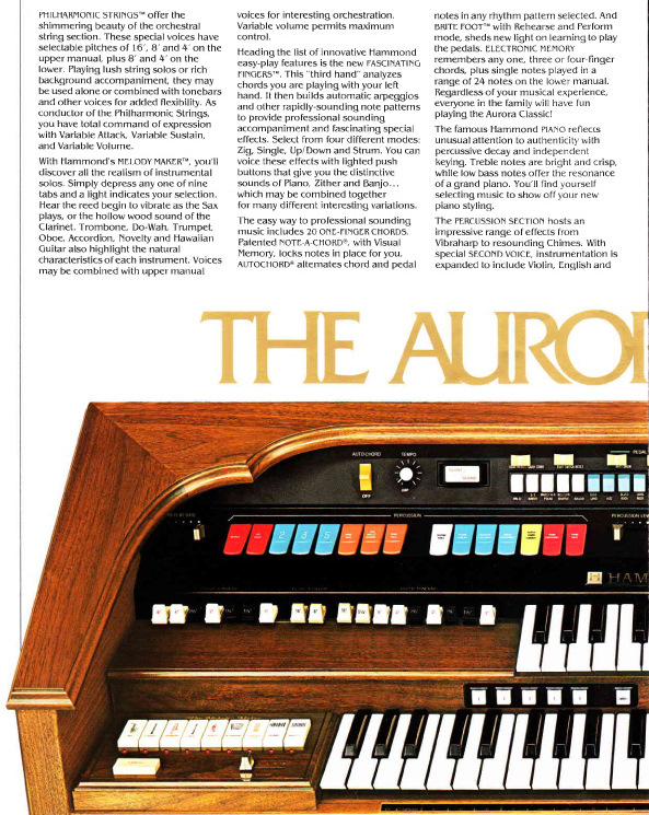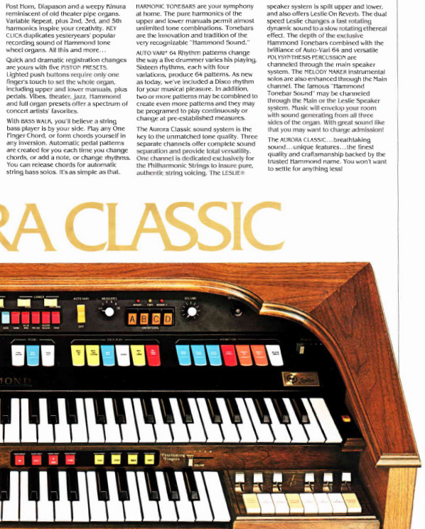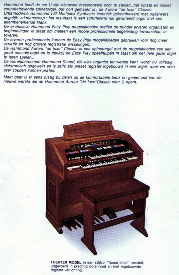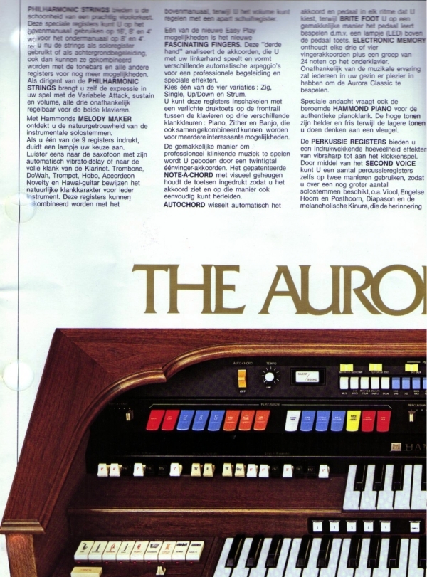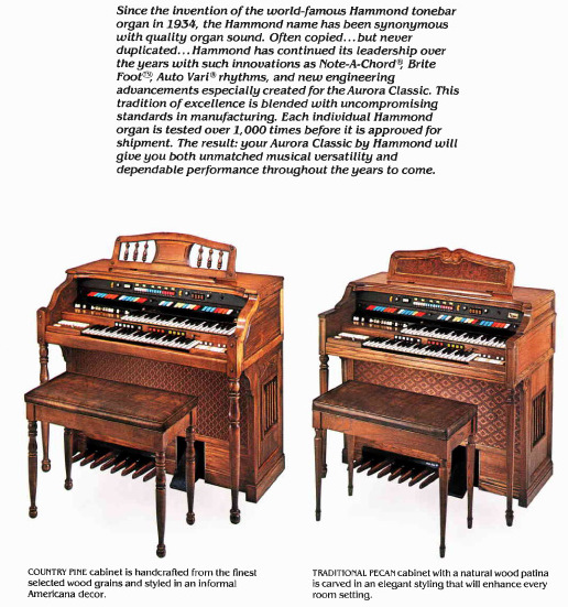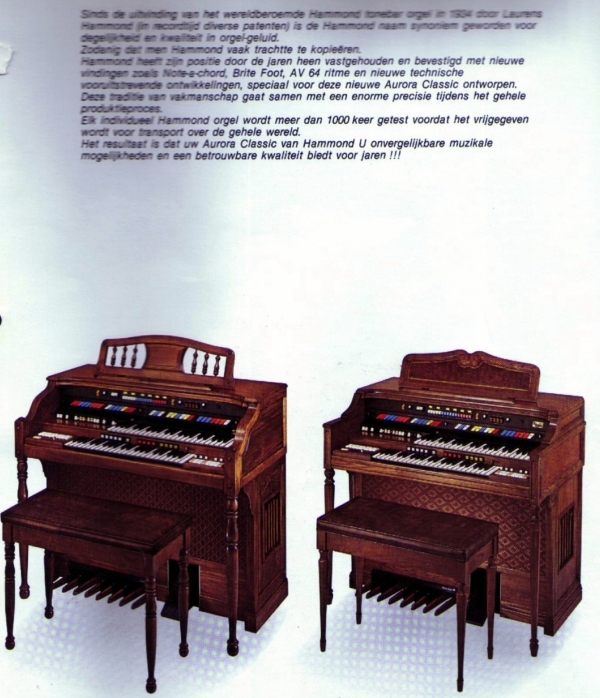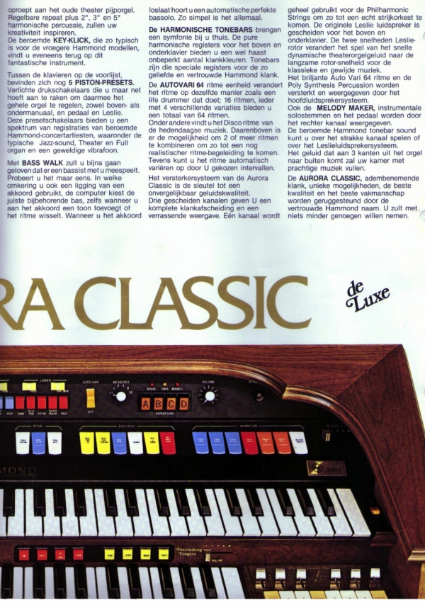 De Aurora Classic was in goede Hammond traditie in meerdere uitvoeringen leverbaar en er kan vastgesteld worden dat ze bij Hammond wel wat van meubelontwerpen wisten en hoogwaardige en aan de andere kant traditionele meubelmakers in dienst hadden.