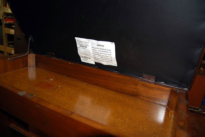In de bank bevond zich een verplichte papieren sticker die meldde, dat de bekleding van de bank uit brandgevaarlijk materiaal gemaakt was.