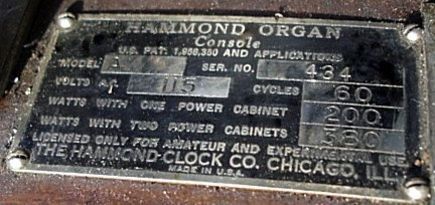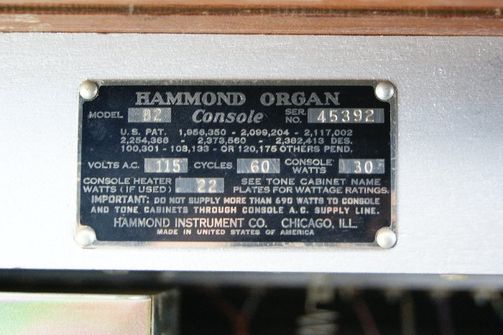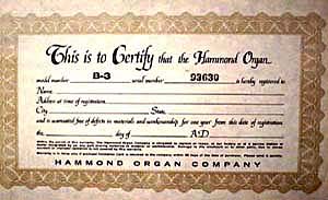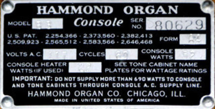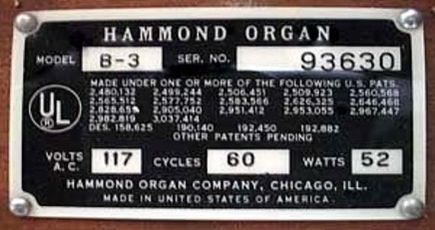 Dan nog het serienummerplaatje van een B-3. Oorspronkelijk had men metalen serienummerplaatjes, doch latere versies hadden geniete papieren exemplaren, die daardoor gemakkelijk teloor gingen indien deze aan de buiten- of onderzijde van het instrument waren bevestigd. Latere versies hebben altijd een papieren serienummerplaatje, met daarnaast soms een tweede onder de toonwielgenerator in de bodem of in de zijkant ontoegankelijk naast de klavieren van het instrument geniet.