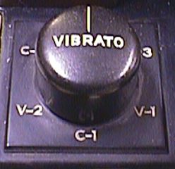 Geheel links van de drawbars zitten 3 registertabs met van links naar rechts: "volume soft", "vibrato bovenmanuaal aan/uit" en "vibrato ondermanuaal aan/uit". Tussen deze registertabs en de drawbars van het bovenmanuaal zit een draaiknop met 6 standen: 3 standen voor het vibrato (V1, V2 en V3) en drie standen voor het chorusvibrato (C1, C2 en C3).