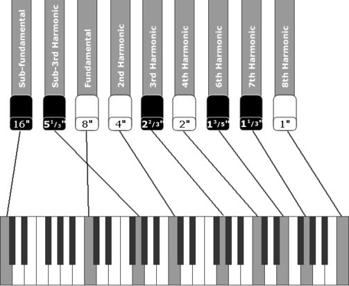 Deze 9 voetmaten worden vervolgens toegevoegd aan een toetscontact systeem van 9 contacten per toets. Vervolgens wordt de klank eventueel van vibrato en/of van percussie voorzien en verder versterkt.