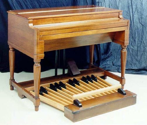 Onder zit het pedaal van twee octaaf en het zwelpedaal, die met een stang het orgel ingaat en in het orgel een variabele condensator bedient.