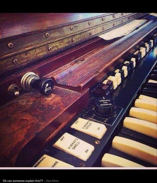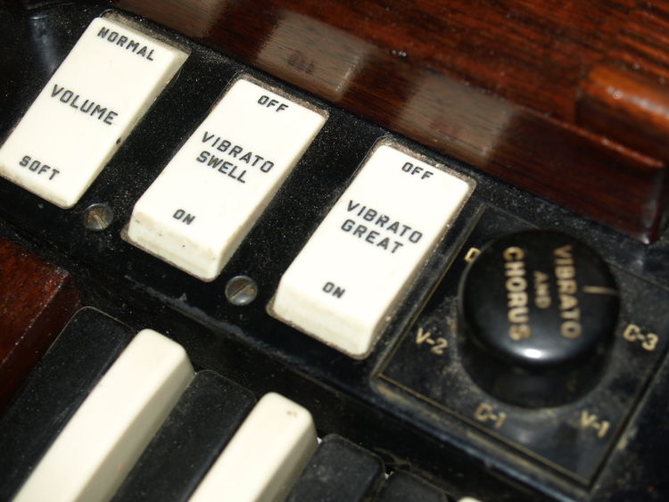 2) Scanner vibrato, onafhankelijk voor boven en onderklavier inschakelbaar (met bovenop het bakje voor de Hammond-olie; 2 keer per jaar nodig). Scanner vibrato is een vinding van John Hanert, welke met zijn vele uitvindingen zorgde voor een enorm aantal Hammond patenten.