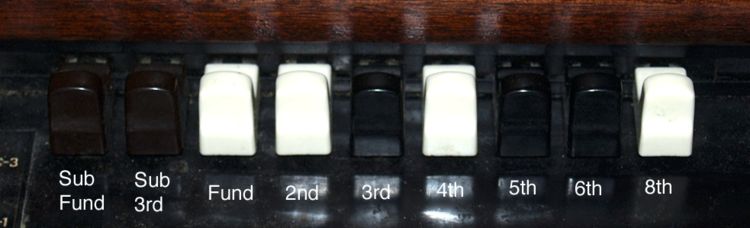 Boven de klavieren zitten 5 sets drawbars: de twee meest linker sets van elk 9 drawbars zijn voor het bovenmanuaal, de twee meest rechter sets van elk 9 drawbars zijn voor het ondermanuaal en de twee drawbars in het midden zijn voor het pedaal (16' en 8').