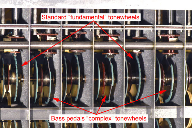 Deze wisselspanning is uit de aard der zaak ook sinusvormig. Deze wisselspanning wordt op zijn beurt versterkt en via een luidspreker weergegeven. Dit resulteert in een sinusvormige toon. Deze toon heeft als kenmerk dat de boventonen ontbreken. Hij klinkt als een doffe fluit. Om nu alle sinusvormige tonen van de laagste t/m de hoogste voetmaat te produceren zijn 91 toonwielen nodig. Deze toonwielen hebben verschillende vertandingen d.w.z. het toonwiel dat de laagste toon produceert heeft 2 tanden. Zo zijn er ook toonwielen met 4, 8, 16, 32, 64, 128 en 192 tanden. Omdat het wiskundig en technisch niet mogelijk is om tussenliggende vertandingen te maken, draaien de verschillende toonwielen ook nog eens met verschillende snelheden. Dit gebeurt d.m.v. versnellingsbakachtige tandwielen in de toonwielgenerator.