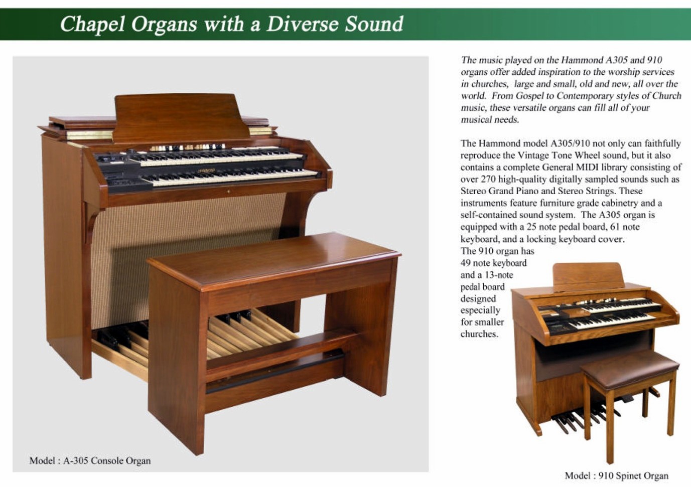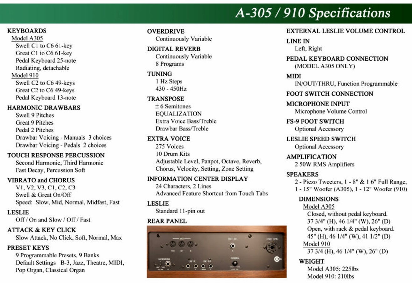 Met zijn ingebouwde speakersysteem, drawbars, extravoices, 90 presets, Floppy-disk-drive, opname-studio en een fraai afsluitbaar deksel is de A-305 een betaalbaar instrument voor vele kerken.