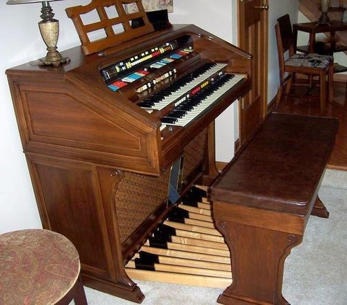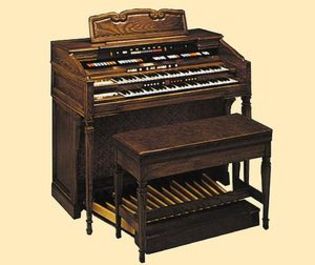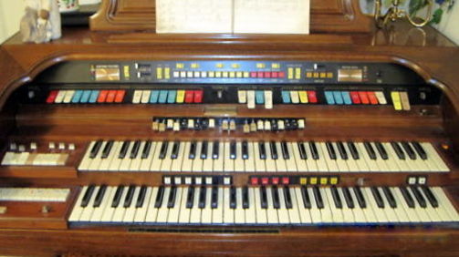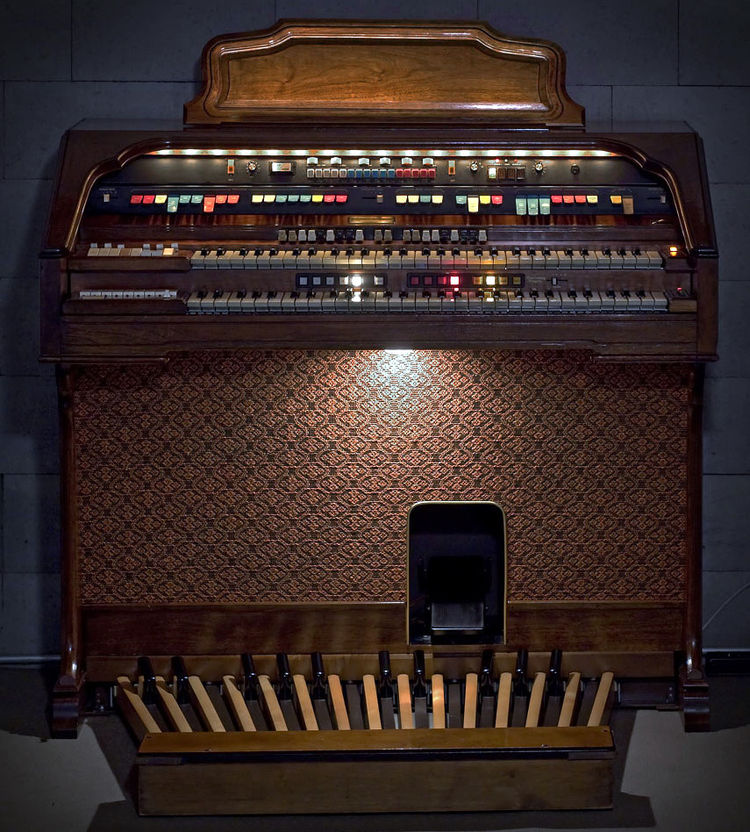 Op deze latere versie is links boven de Laurens Hammond medaille geplaatst. Let ook op de witte vierkante Leslie box schakelaars in het midden rechts tussen de klavieren.
