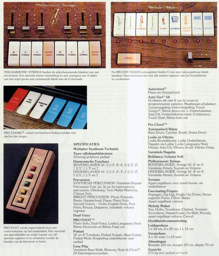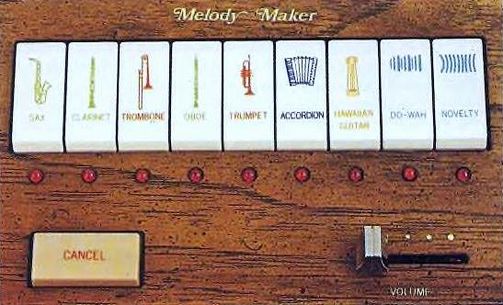 Verder zorgde de bekende "Melody-maker" (de naam is best bijzonder gekozen, want de melodie moest je toch altijd nog zelf maken) voor een aantal orchestrale stemmen. Enkele heel goed, andere wat minder van muzikale kwaliteit, maar goed bruikbaar. Overigens is het moeilijk een naam voor een instrument dan wel voor een effect te bedenken en dan ook nog een naam die het international goed doet en niet een of andere rare of gek getinte connotatie heeft....