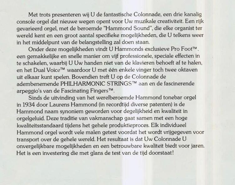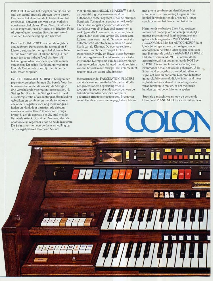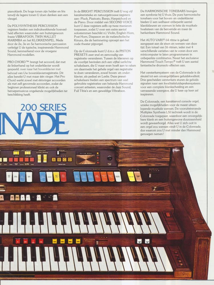 De Hammond Colonnade was een behoorlijk uitgebreid orgel en ondanks dat, was het meubel veel minder breed dan vele van zijn voorgangers. Doordat dit chique instrument veel minder ruimte in nam, genoot de Colonnade in ons lage landje veel belangstelling.