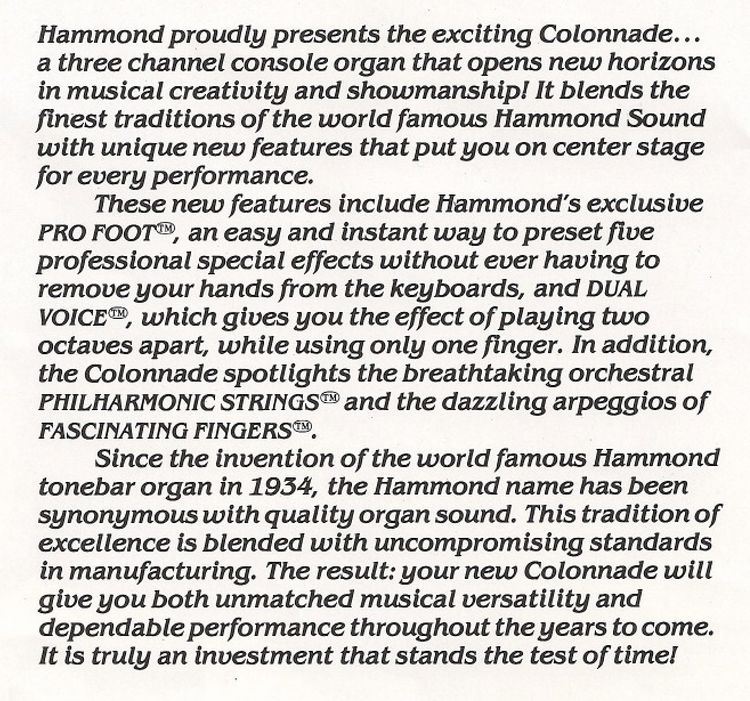 Als extra effect word de Colonnade voorzien van Pro-Chord. Deze functie hield in, dat wanneer je een akkoord aanhield op het onderklavier en hoewel je op het bovenklavier met één vinger speelde, uit de informatie van het onderklavier boven een compleet akkoord weergegeven werd. Zodoende kon je als een "professional" klinken.