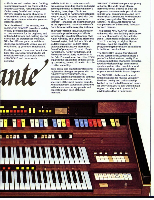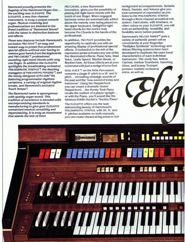 De Elegante was bedoeld als een orgel , dat het allemaal had. Dus alles op het gebied van theater-orgel, moderne geluiden, key-click voor de jazz liefhebber, etc. Voor alle eerst genoemde takken van sport voldeed het orgel uitstekend, maar voor de jazz liefhebber miste hij (net als vroegere H-100-serie) de pit, terwijl in haar innerste toch ook IC's zaten, die uit de B-3000 kwamen, welke best wel pit had.