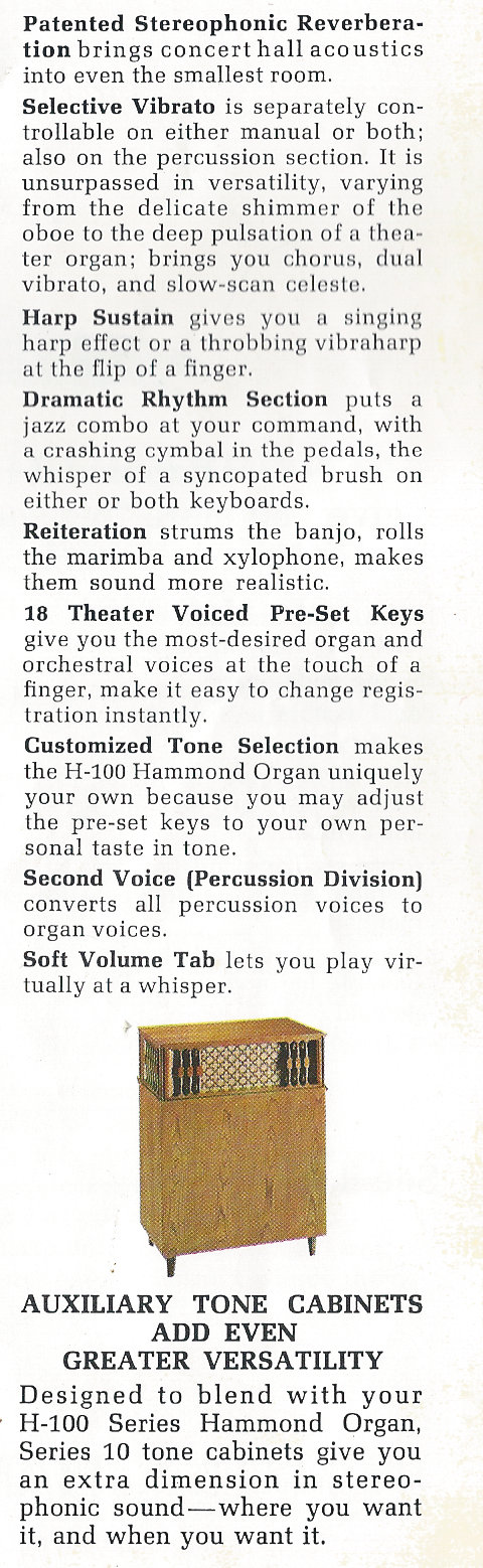 Het geluid was, in verhouding met een ongetemd beest als de B-3, rustig en ingehouden te noemen, met weinig keyklick en een rustige toon aanzet. Hierdoor was hij ideaal voor theater-muziek en entertainment, maar ook zeer geschikt voor een flink partijtje Bach. Dus van "Bach tot Bacharach"