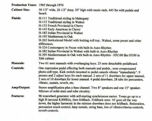 Door het stereo speaker systeem klonk hij erg mooi en breed. Er zijn ook modellen op de markt gebracht met een 32-polige scanner, waardoor hij bijna klonk als over een Leslie-box. Hieronder de modellenreeks en de specs.