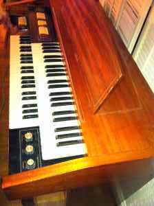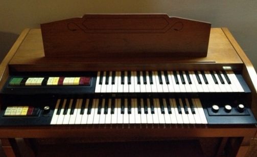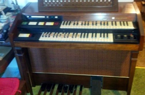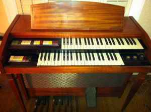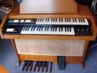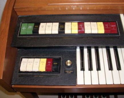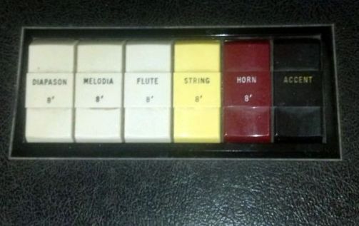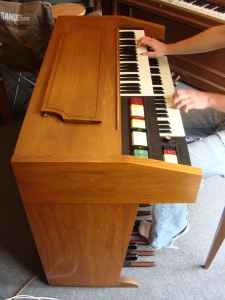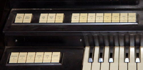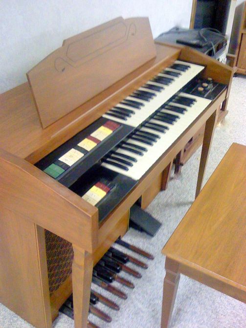 Tonal controls:16 voice tabs. Upper manual has five 8' voices and three 16' voices.