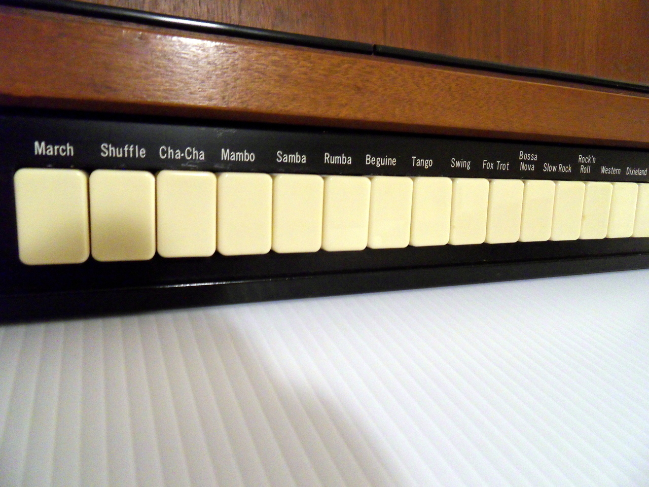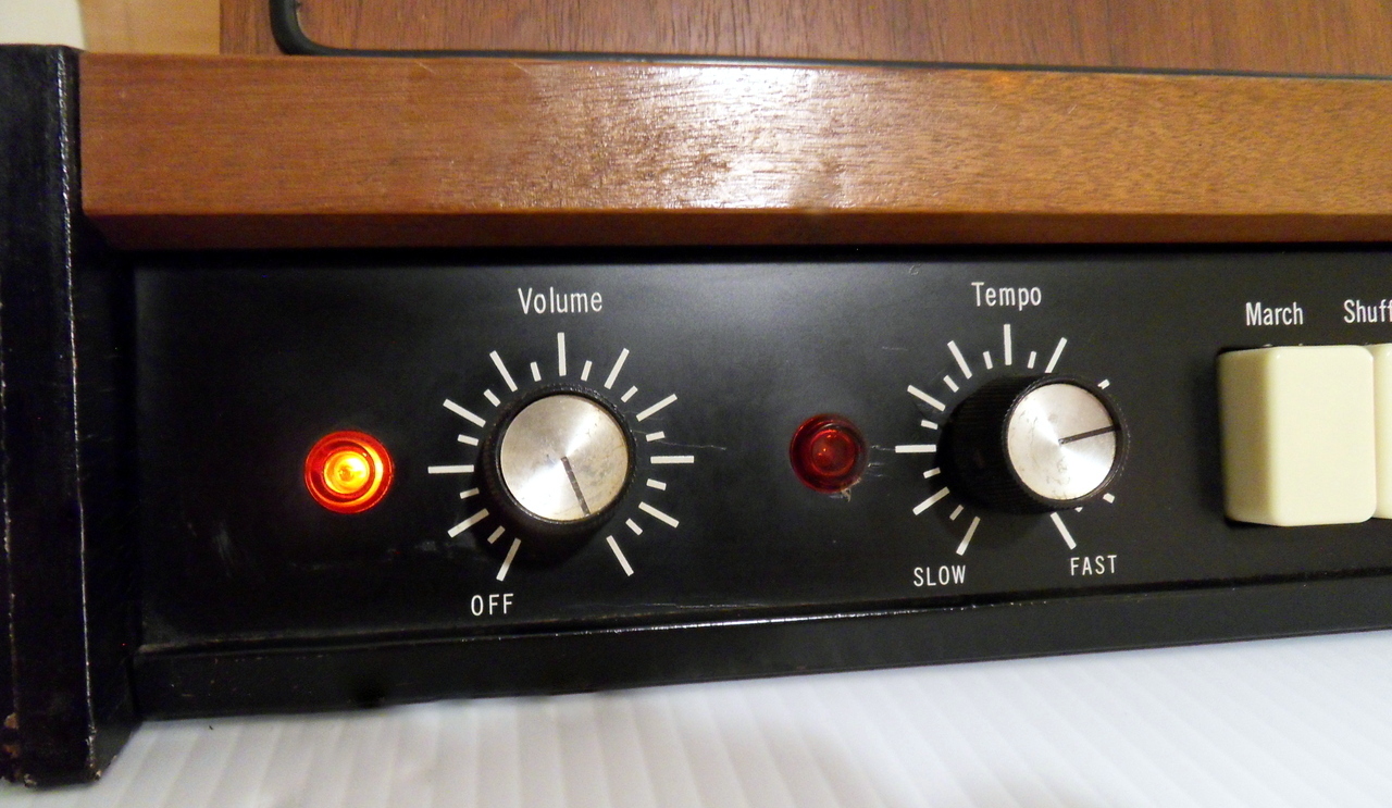 Front panel has adjustable volume and tempo control knobs, 16 rhythm buttons, 3 mute buttons, a Stop/Start button and 2 lights - 1 indicating power is on and the other flashing with the beat like a metronome.