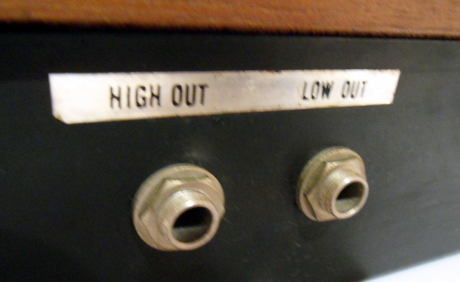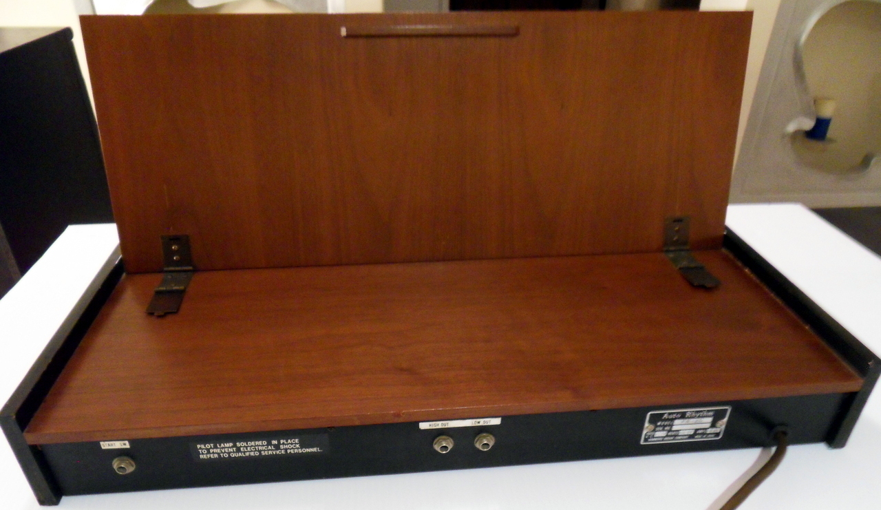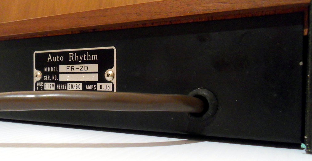 Rear panel has a 1/4" input for a Stop/Start foot switch, 2 unbalanced 1/4" outputs (high out - low out) and a surprisingly thick high quality power cord compared to its twin (Rhythm Ace FR2L) power cord.