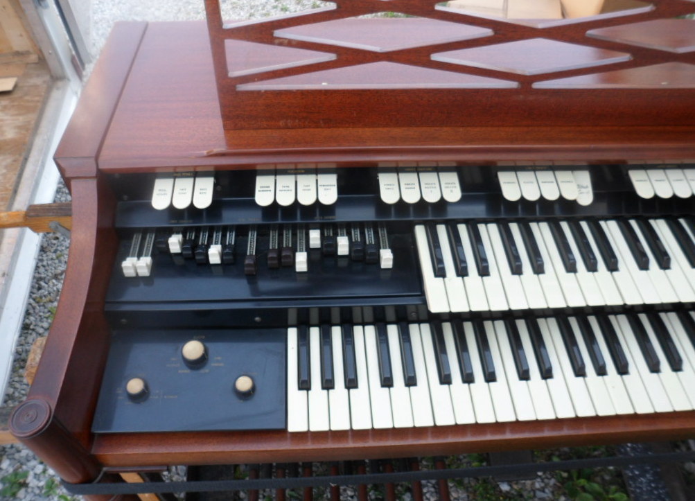 Op het linker onderbakstuk bevonden zich een drietal ronde draai-schakelaars voor Ritme, Vibrato en Percussion effecten.