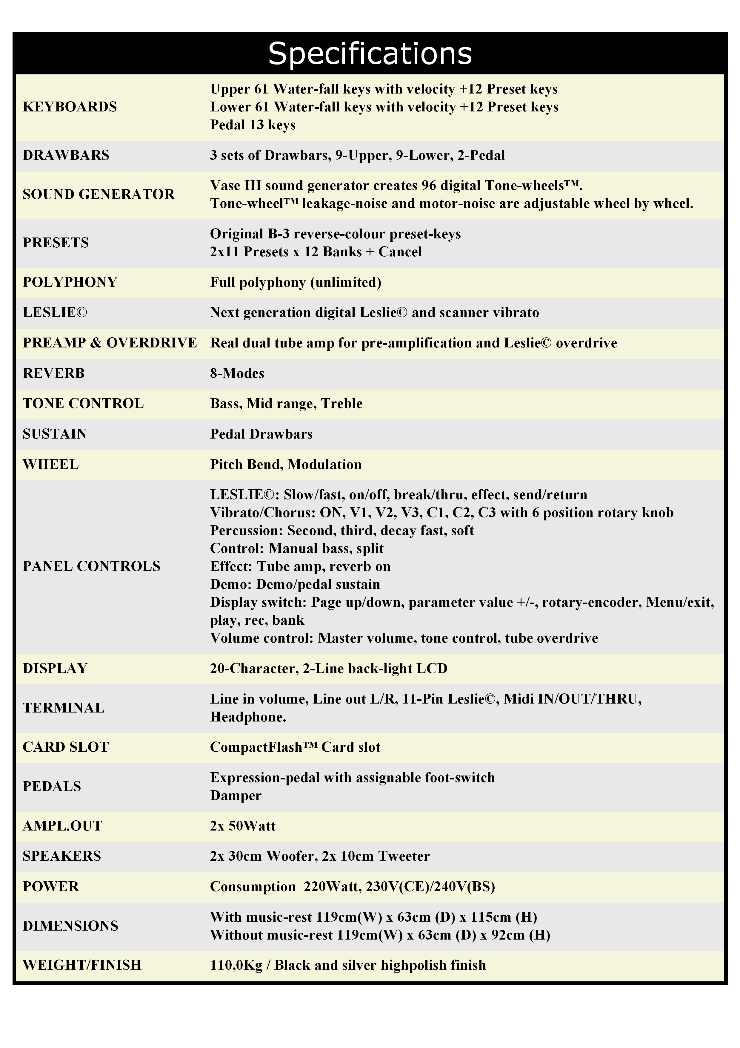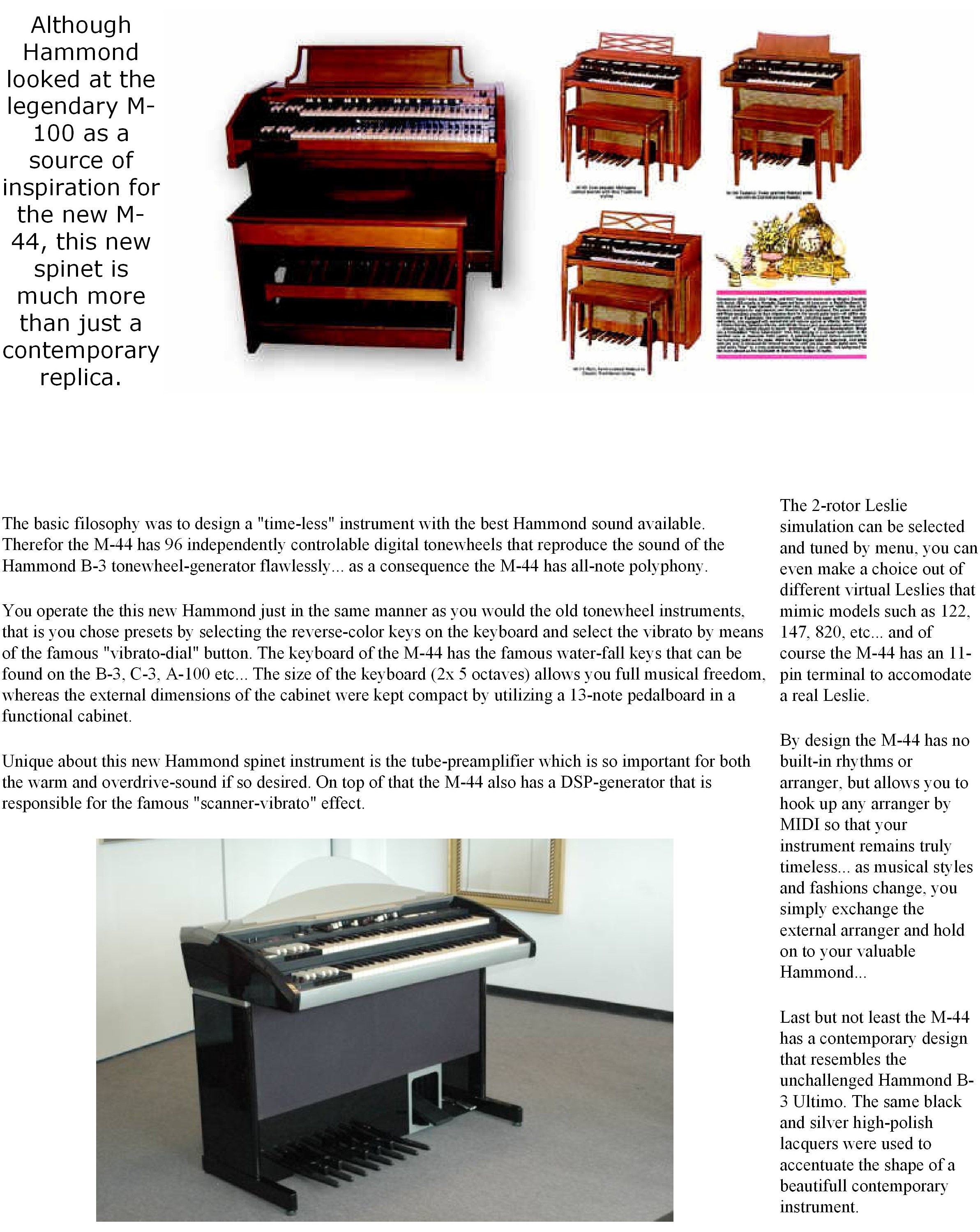 Omdat het instrument alle techniek in zich heeft van de NEW B-3 en 96 [!] virtuele toonwielen heeft en ook beschikt over de aangename 2 x 5 octaafs "Waterfall" klavieren, hebben we toch besloten voor de overzichtelijkheid van deze site dit type niet onder de B te plaatsen maar onder de M. We moeten consistent blijven nietwaar.....