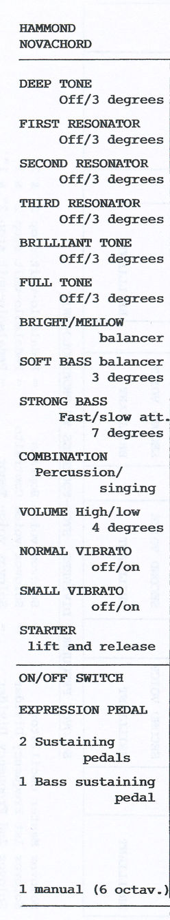 Het instrument bezat één klavier met 72 toetsen, 12 buizen oscilatoren en 5 frequentie delers per oscillator. In totaal zaten er in een NOVACHORD 163 vacuümbuizen.