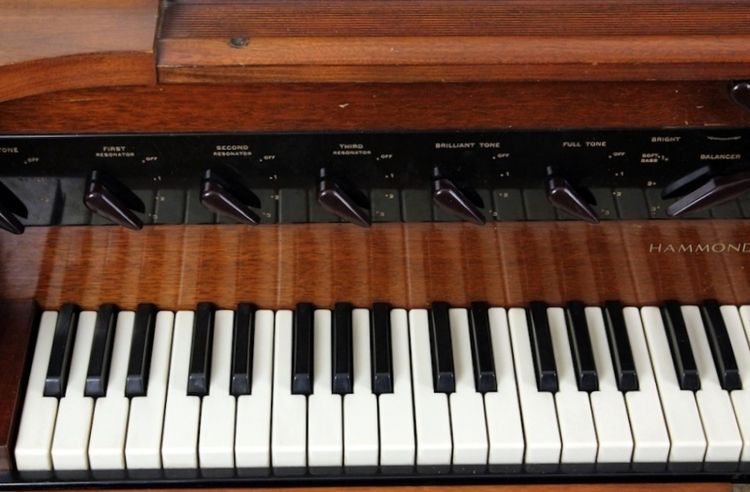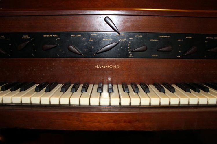 Maar liefst vier parelwitte Novachords spelen samen met een Hammond model A.