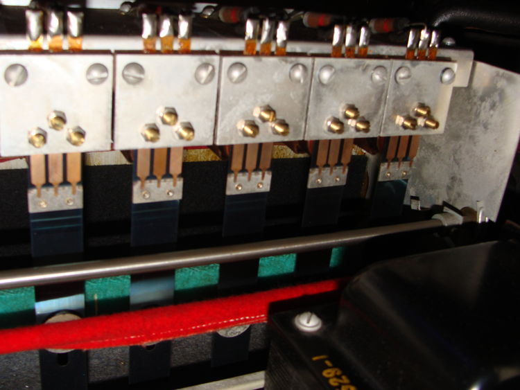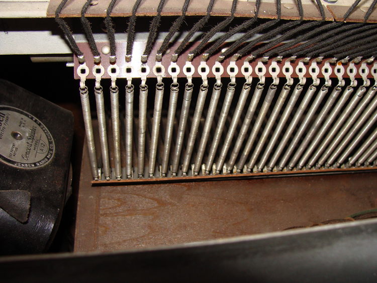 Een geniale uitvinding van Laurens Hammond (de Novachord is een uitvinding van Hanert) waren deze vijf "dansende veertjes", die, zorgen voor meerdere zeer natuurlijke vibrato frequenties. Met de koperen schroefjes kan het een en ander afgeregeld worden: