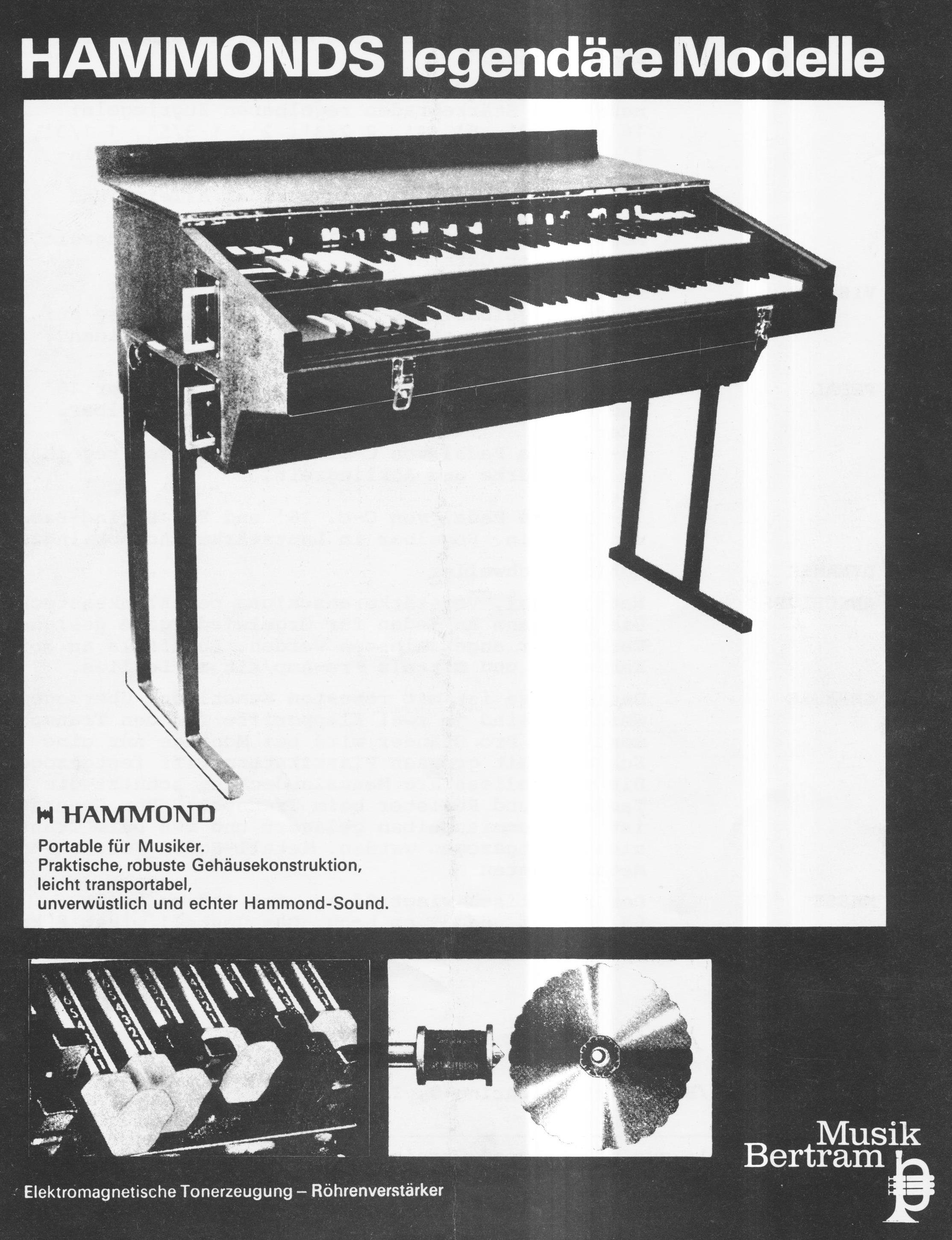 Persoonlijk ben ik nooit gecharmeerd geweest van het feit dat wie dan ook orgels ging kannibaliseren. Bovendien zijn er oudere modellen gebruikt zoals B 2 en C 2 die met Trek apparatuur etc van percussion werden voorzien. Niet helemaal mijn ding dus, te meer, daar een portable uitvoering ook beslist nog zwaar was om te transporteren. Desalniettemin, Bertram is knap aktief geweest op dat terrein en dat is ze vanzelf niet kwalijk te nemen.