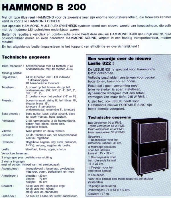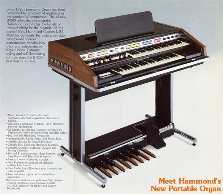 De B-200 was de opvolger van de succesvolle X-5. Dit instrument kun je min of meer vergelijken met een Aurora 8222 in een portable uitvoering. De meningen waren verdeeld over dit instrument. Een aantal onhebbelijkheden van de X-5 waren uit de B-200 weggenomen, zoals de problemen die konden ontstaan als iemand uit een dansende menigte voor de band op de kabels van je orgel gingen staan, die aan de achterkant uit het onderstel kwamen. De 220 volt liep ook door de Lesliekabel (met die fameuze 9 pin Leslie plug, waarvan de midden geleide pin altijd afbrak) met als gevolg dat er geheid kortsluiting ontstond en dan viel er helemaal niet veel meer te dansen. Voor niemand wel te verstaan.