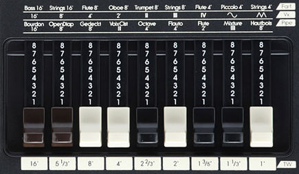 The Organ Generator may be switched to provide authentic models of Vox Continental, Vox Jaguar and Farfisa Combo Organs, all of which can be registered in the original fashion. The fourth Organ mode calls 32 ranks of Genuine Classical (“Church”) Pipe Organ voices derived from our Flagship Model 935 Church Organ.