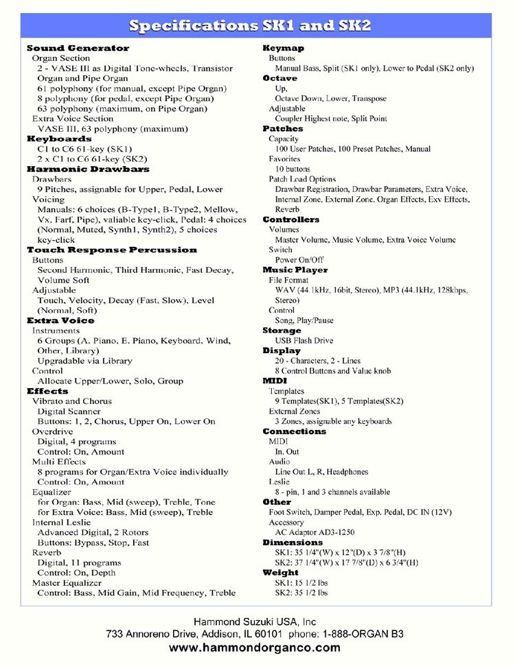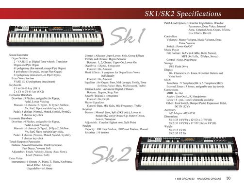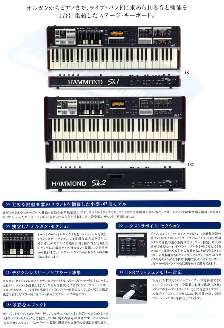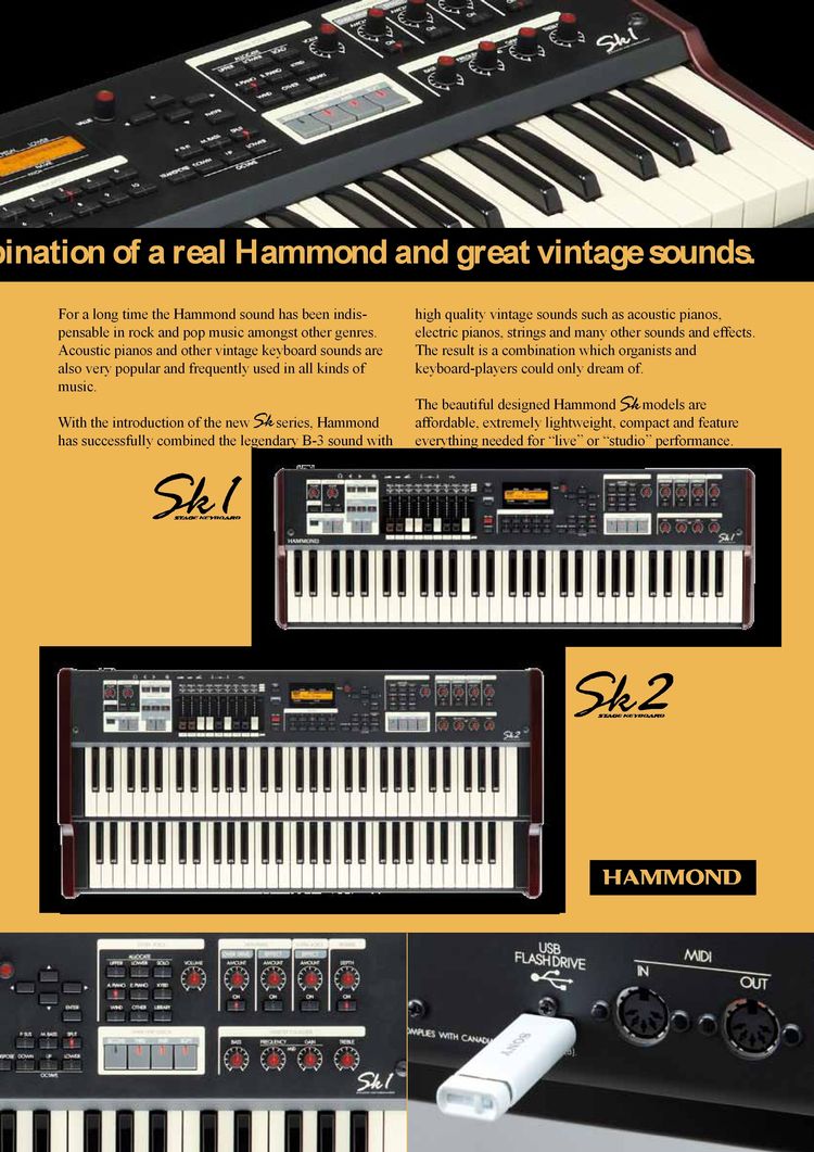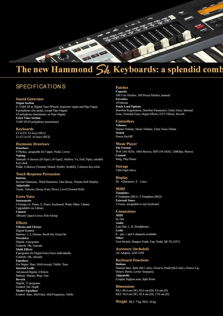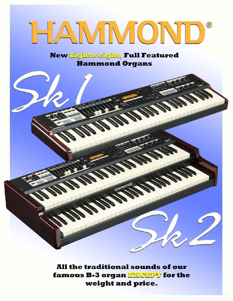 The SK Series Stage Keyboards are the most revolutionary HAMMONDS yet, from the company that invented and perfected the Drawbar/Tonewheel concept in 1934. These ultralight instruments provide the essential keyboard sounds required to play ANY show in ANY style, including a genuine and vintage-perfect HAMMOND Organ in compact packages with all the features expected in a vintage B-3, plus our most advanced Digital Leslie yet.