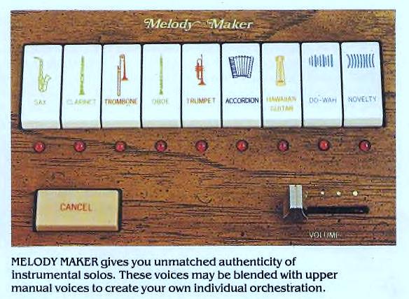 Exciting instrumental sounds are found with the breathy Accordion, romantic Hawaiian Guitar, sassy Do-Wah and unique novelty. Variable Volume allows you to custom blend these voices with all the other upper manual voices for your own personal sound.