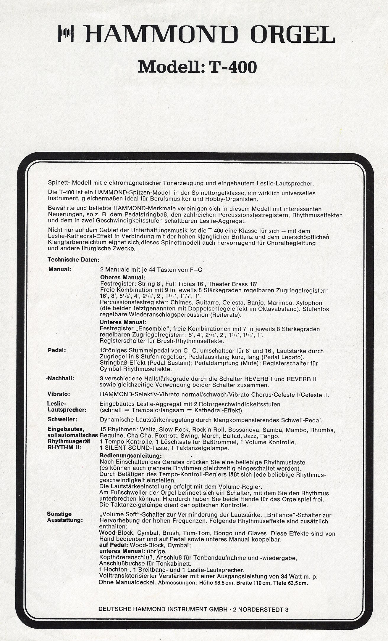In elektrisch opzicht vergelijkbaar met een T-400, maar met een aantal functies, die later zou worden over genomen in de T-500 serie - zoals split vibrato en een standaard Leslie socket. Een reeks van kleine toon kasten (een normale luidspreker en een speciale Leslie-achtige speaker) maakte deel uit van het pakket.  |