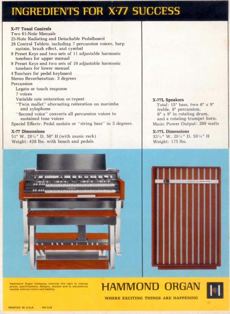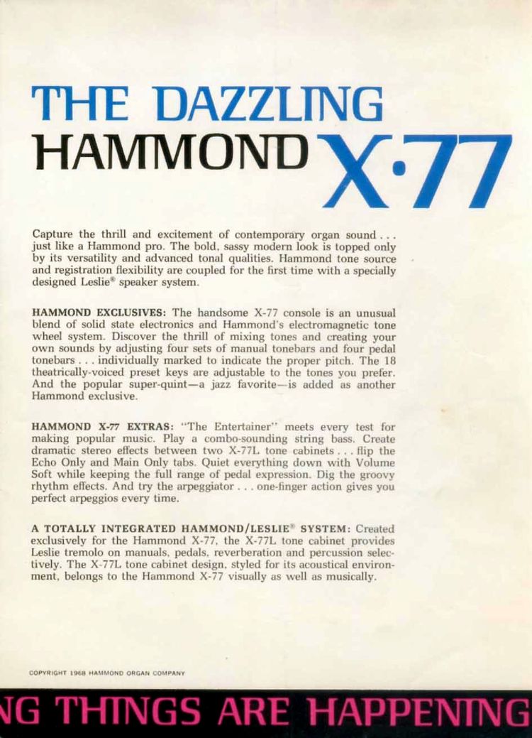 De Hammond X77 / X77GT is werkelijk een van de grote "mastodonten" uit de orgelwereld. Zowel qua afmeting, gebruikte techniek, als in beschikbare mogelijkheden is het werkelijk een indrukwekkende ontwerp prestatie te noemen.