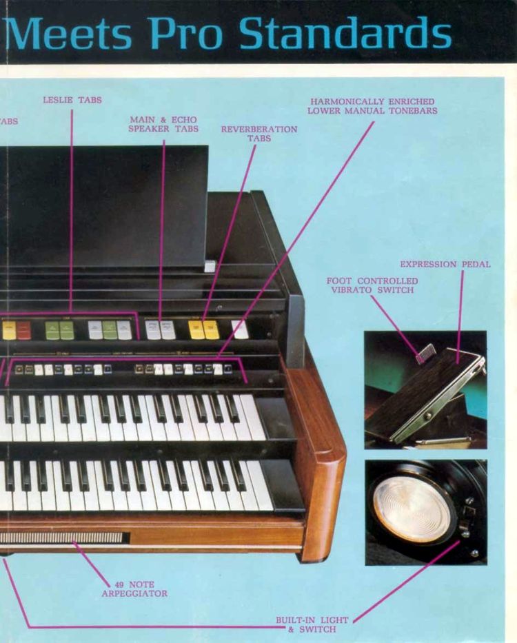 49-tonige arpeggiator onder de klavieren. (Dit is een ontwerpfout, want een arpeggiator moet altijd tussen de klavieren geplaatst zijn.)