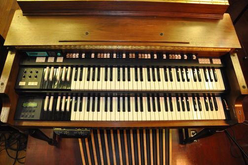 De nieuwe geluiden konden door álle klavieren worden aangestuurd, dus ook een lekker swingende string-bass op het pedaal.