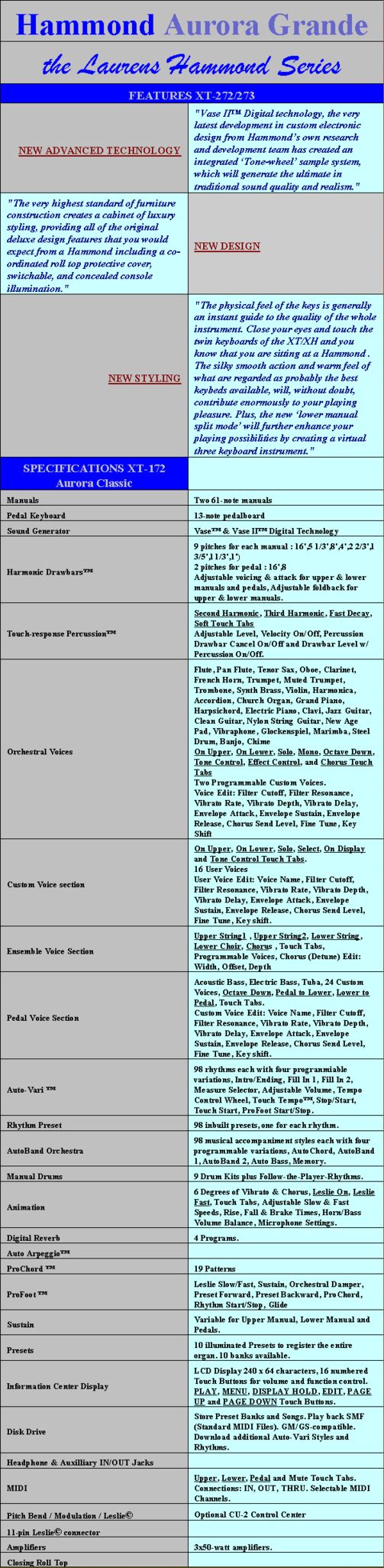 Naast de drawbar secties, had je ook een behoorlijk aantal orchestrale stemmen, die aan te passen waren aan de persoonlijke smaak en als zodanig weer op te slaan waren. Nieuwe ritmes waren te koop en via een floppy-disk in te laden.
