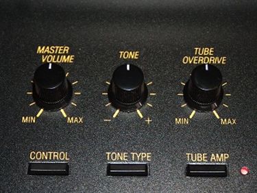 Mastervolume, klankkleur en overdrive-effect worden met ouderwetse draaiknoppen bediend.