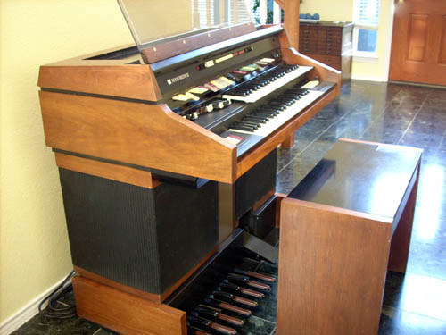 Geheel in tegenstelling tot de logische verwachtingen valt er nog iets speciaals op aan dit instrument. Bij nadere bestudering van de brochure zien we een Hammond vreemd rotary speaker systeem: