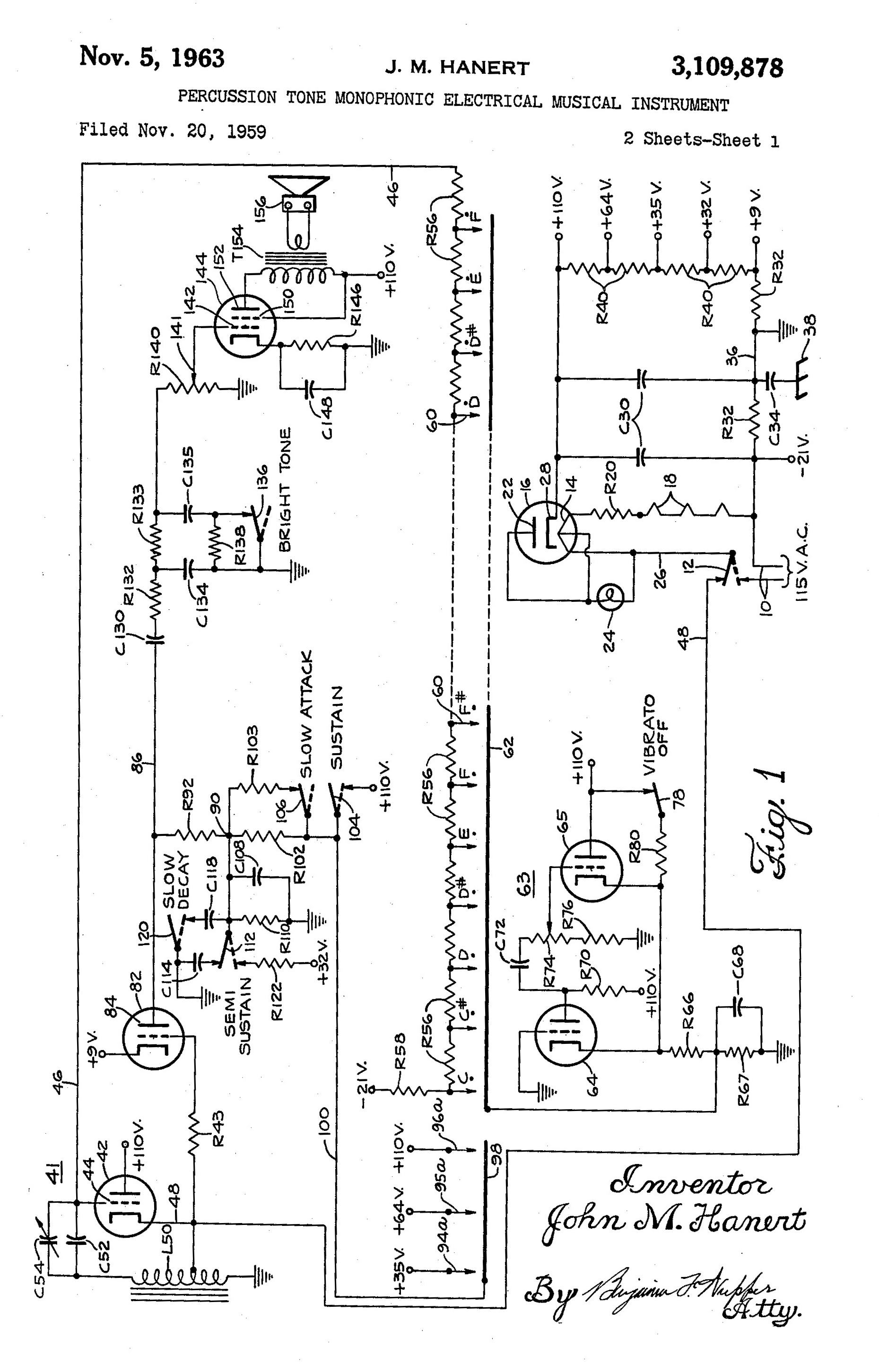C114. when the semi-sustain switch 112 is in its full line position. The terminal may also be connected to ground througha capacitor C118 When a slow decay switch 12-8 is in its dotted line position. When the switch 112 is in dotted line position, the terminal hit is connected to the +32 v. terminal .by a decay resistor R122, to produce low amplitude semi-sustained tones.