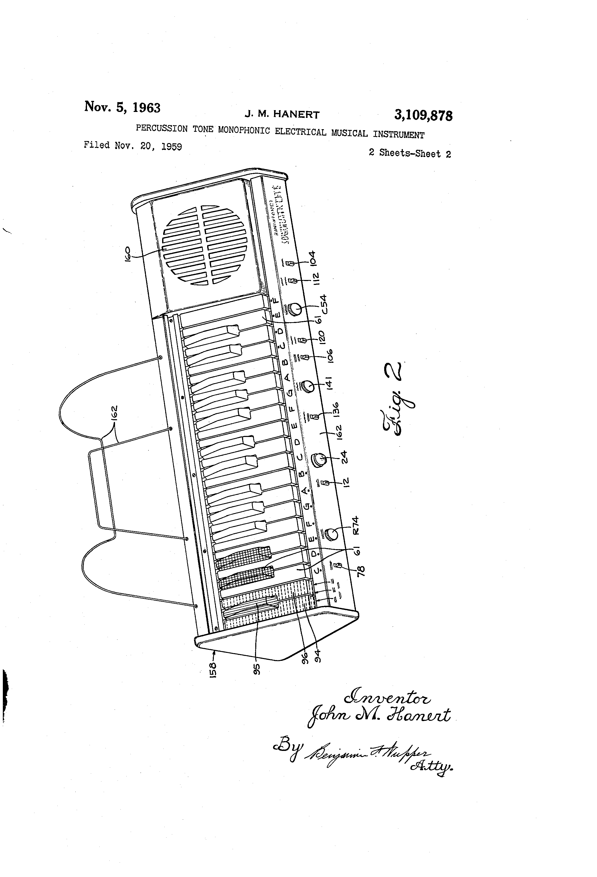 TRUMENT J. M. HANERT Nov. 5, 1963 PERCUSSION TONE MONOPHONIC ELECTRICAL MUSICAL INS 2 Sheets-Sheet 1 Filed NOV. 20, 1959 J. M. HANERT 3,109,878 PERCUSSION TONE MONOPHONIC ELECTRICAL MUSICAL INSTRUMENT Nov. 5, 1963 2 Sheets-Sheet 2 Filed Nov. 20, 1959 United States Patent 3,169,378 PERCUSSION TONE MONOPHONIC ELECTRONICAL MUSICAL lNTRUMENT John M. Hanert, Des Plaines, llh, assignor to Hammond Organ Company, Ohicago, lit, a corporation of Delawere Filed Nov. 20, 195?, Ser. No. $54,353 8 laims. (Cl. 84-l.12)