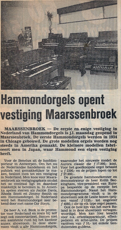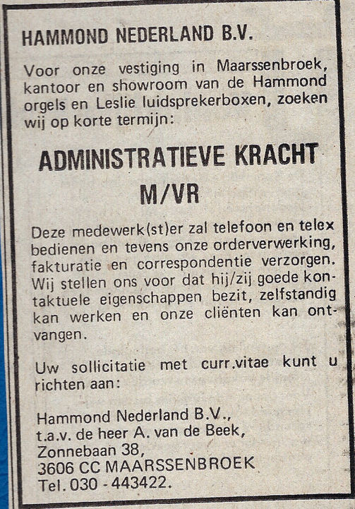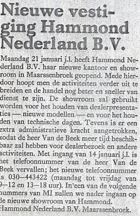 Hammond Nederland BV was gevestigd aan de Zonnebaan 38, 3606 CC Maarssen, tel 030-443422 en is op 27041979 geopend. De eerste secretaresse was Els Huitink, die opgevolgd werd door Irma de Vries.