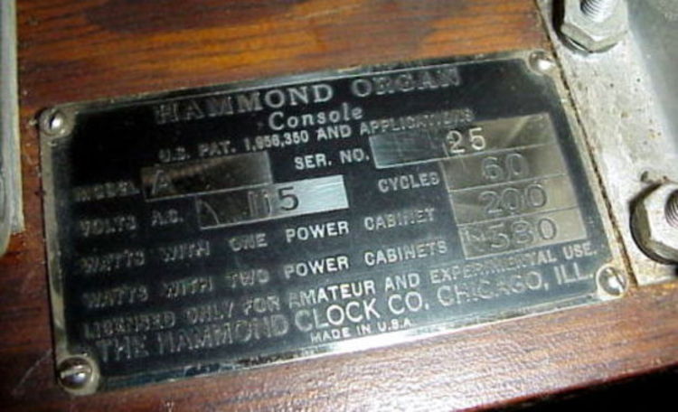 Kinderachtig, maar echt weer Amerikaans was, zoals hier direct boven te zien is, het orgel alleen gelicenceerd voor "amateur en experimenteel gebruik", omdat Laurens Hammond allerlei rechtzaken moest voeren, flink dwarsgezeten door de pijporgel-fabrikanten, en daarom werd hij door de FTC (Federal Trade Commission) in 1936 gedwongen dit op zijn serieplaatjes te vermelden om toestemming te krijgen zijn instrumenten te verkopen, zolang de hele zaak niet was opgelost.