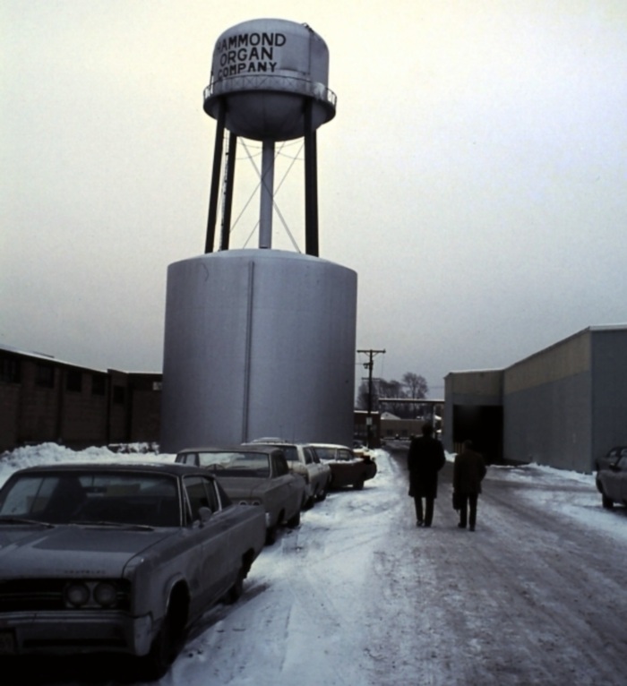 De typische watertoren van de Hammond fabriek in Chicago (foto Aart van de Beek).