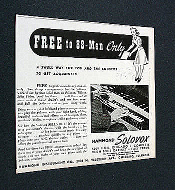 The Solovox, generating sound with vacuum tubes, had a three octave keyboard arranged like the piano, but it could be played over a six octave range. It had 12 tone selectors that produced a broad range of sound effects instantly popular with piano entertainers and piano owners. Three models were brought out in the years from 1940 to 1948 after which it was discontinued. One of the many women who became famous and helped the popularity of the electric organ was the noted organist Ethel Smith.