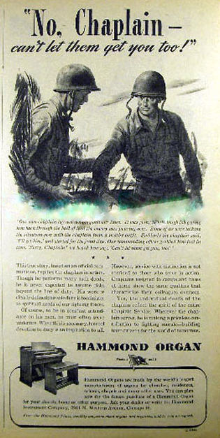 The other new employee who joined the Hammond staff in 1937 was John A. Volkober, who started as an office boy. In 1965 he was named president of Hammond Organ Company when Sorensen became chairman of the board. The term "routine" might have been applied to the Hammond business in 1937 until one day a "time bomb’ communication was received. It was so-called stipulation from the Federal Trade Commission asserting that certain statements in Hammond advertising were not completely accurate. The complaint, in general, said that the Hammond instrument was not an "organ" and that it could not produce an "infinite number" of tonal variations. Laurens Hammond, more the self-effacing and quiet inventor than a public pugilist, nevertheless decided to fight. He was a participant in one of the most amazing events in the history of music The FTC had decided to have an impartial panel listen to a $75,000 pipe organ and a $2,600 Hammond installation to determine whether the panelists could tell the difference. Players of both instruments were hidden from view by screens and the Hammond speaker cabinets were concealed among the organ pipes at the University of Chicago Chapel. A panel of 15 students and 15 professional musicians was asked to record whether it was the pipe organ or the Hammond electric organ that was being played in a number of test pieces. That these jurors were wrong in their answers ten times out of 3O was indication enough that the Hammond had carved itself a permanent niche in the musical instrument field. A year later the FTC decided that the company could call its instrument an organ but must desist from claiming an infinite number of tones: for after all, it could produce only 253,000,000 tones! Affairs of the company were not greatly disturbed in 1940, although the year was marked with recognition of Laurens Hammond’s electronic organ at two of the highest scientific and industrial levels. He was awarded the Franklin Institute’s John Price Wetherell medal and the National Association of Manufacturers’ Modern Pioneer Award. Pearl Harbor year of 1941 marked the end of Hammond’s civilian production for the duration, as it did for so many others. America’s entry into the war put Hammond into the military production "front lines" However a limited run of electric alarm clocks was produced, and about 1,400 "GI" electric organs were made for service personnel on ship and shore around the world.