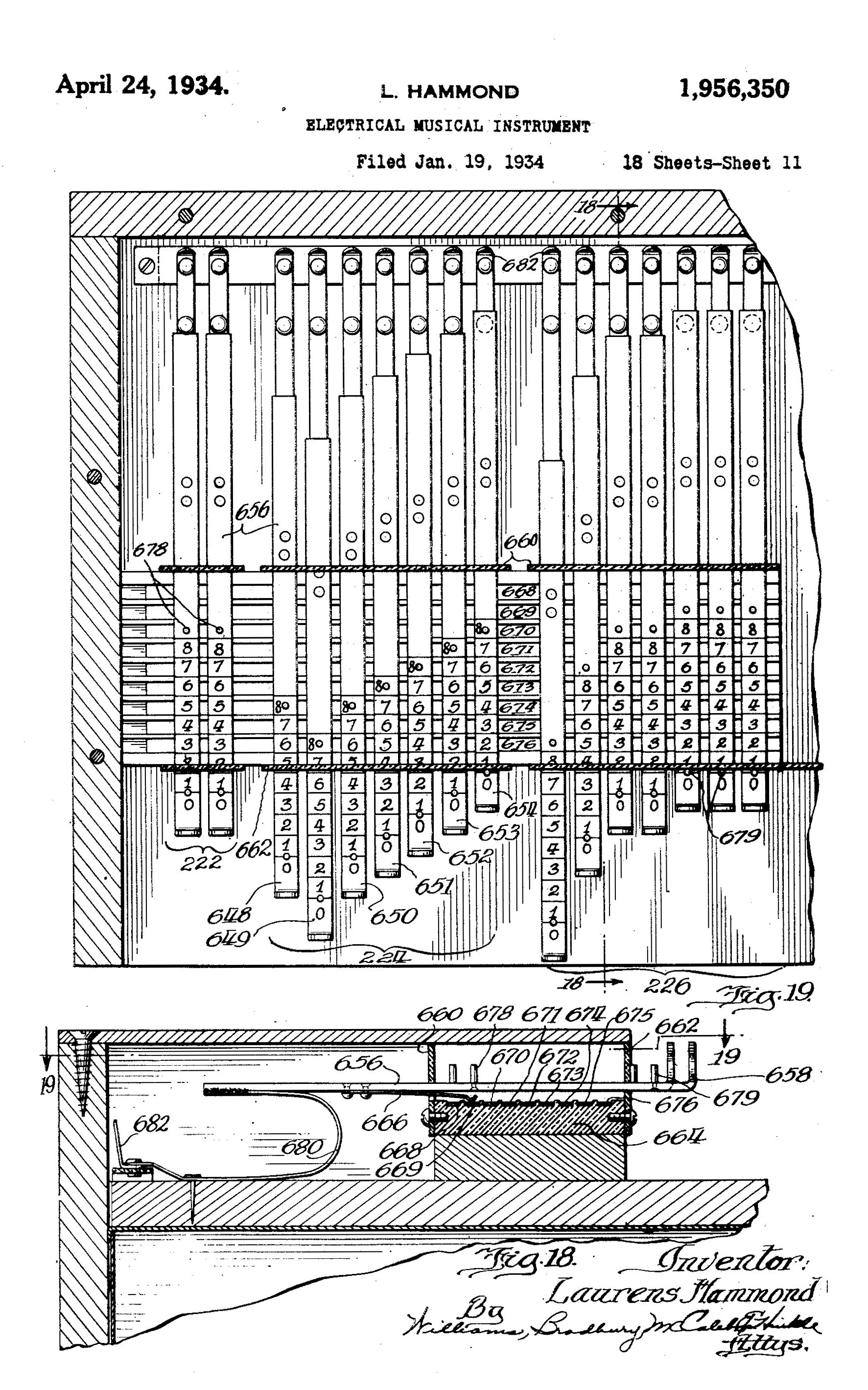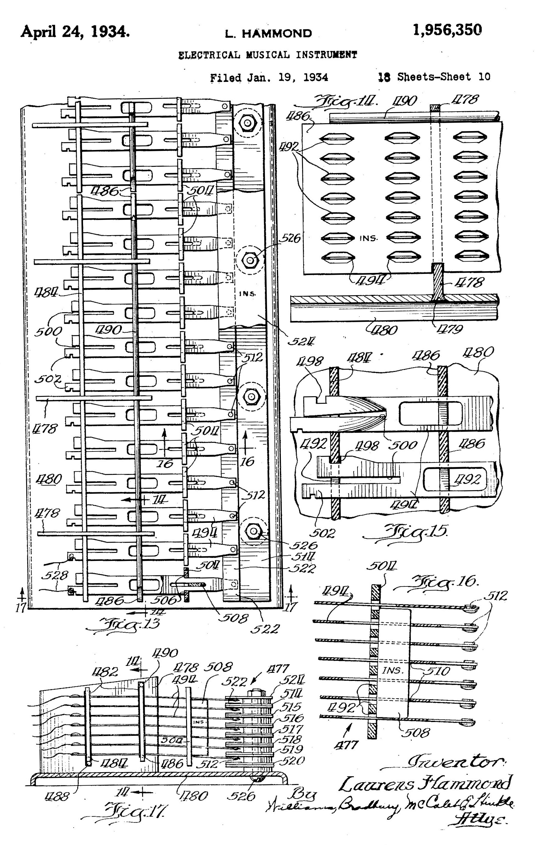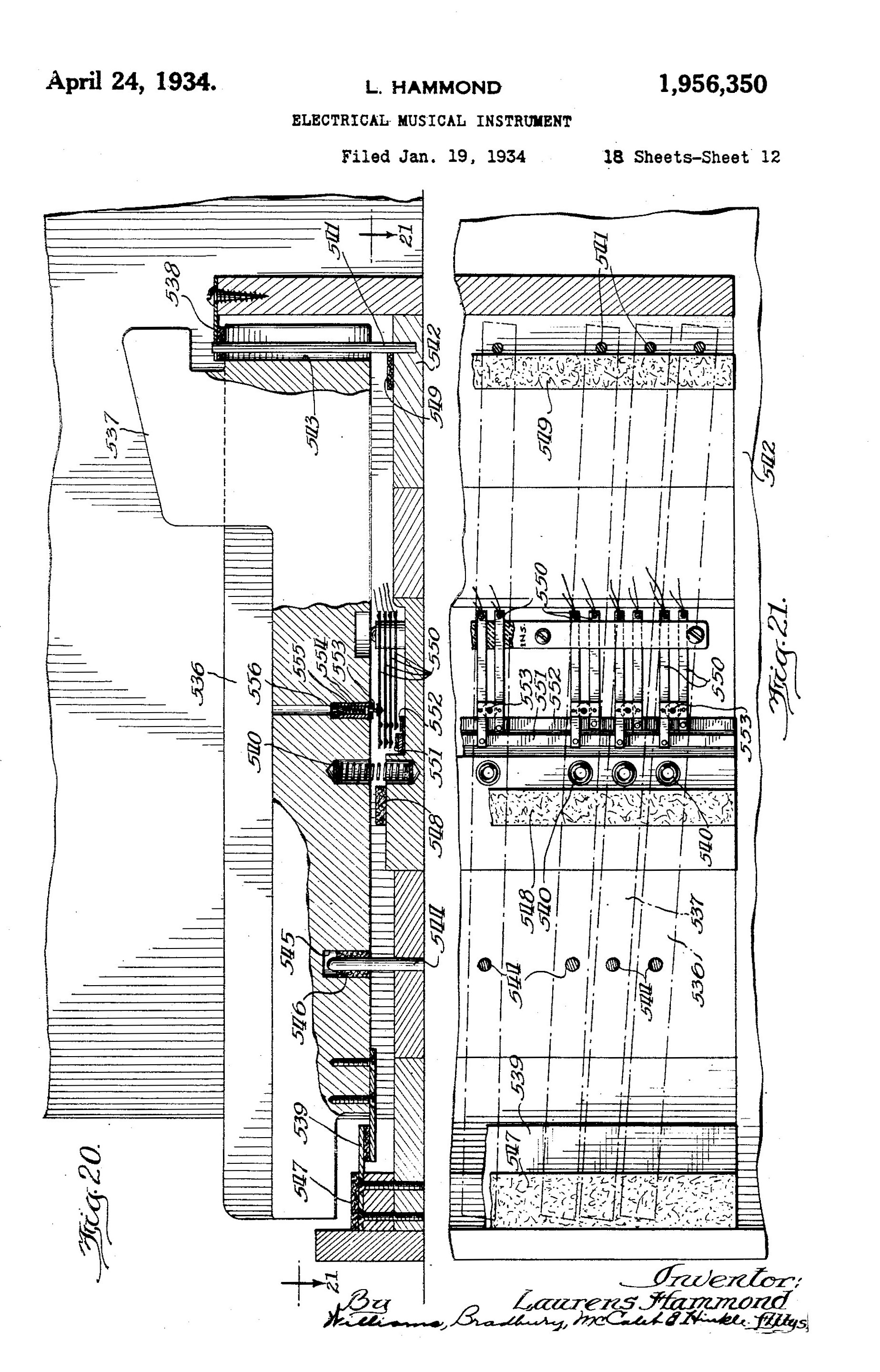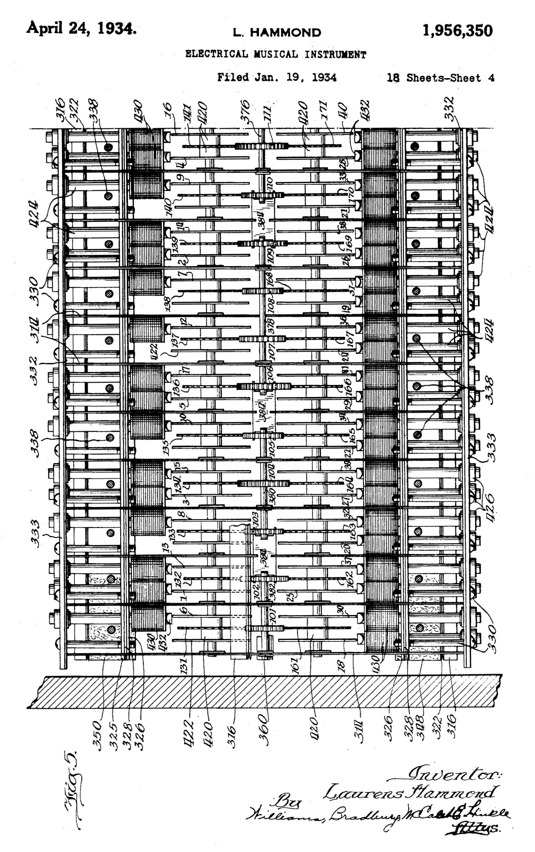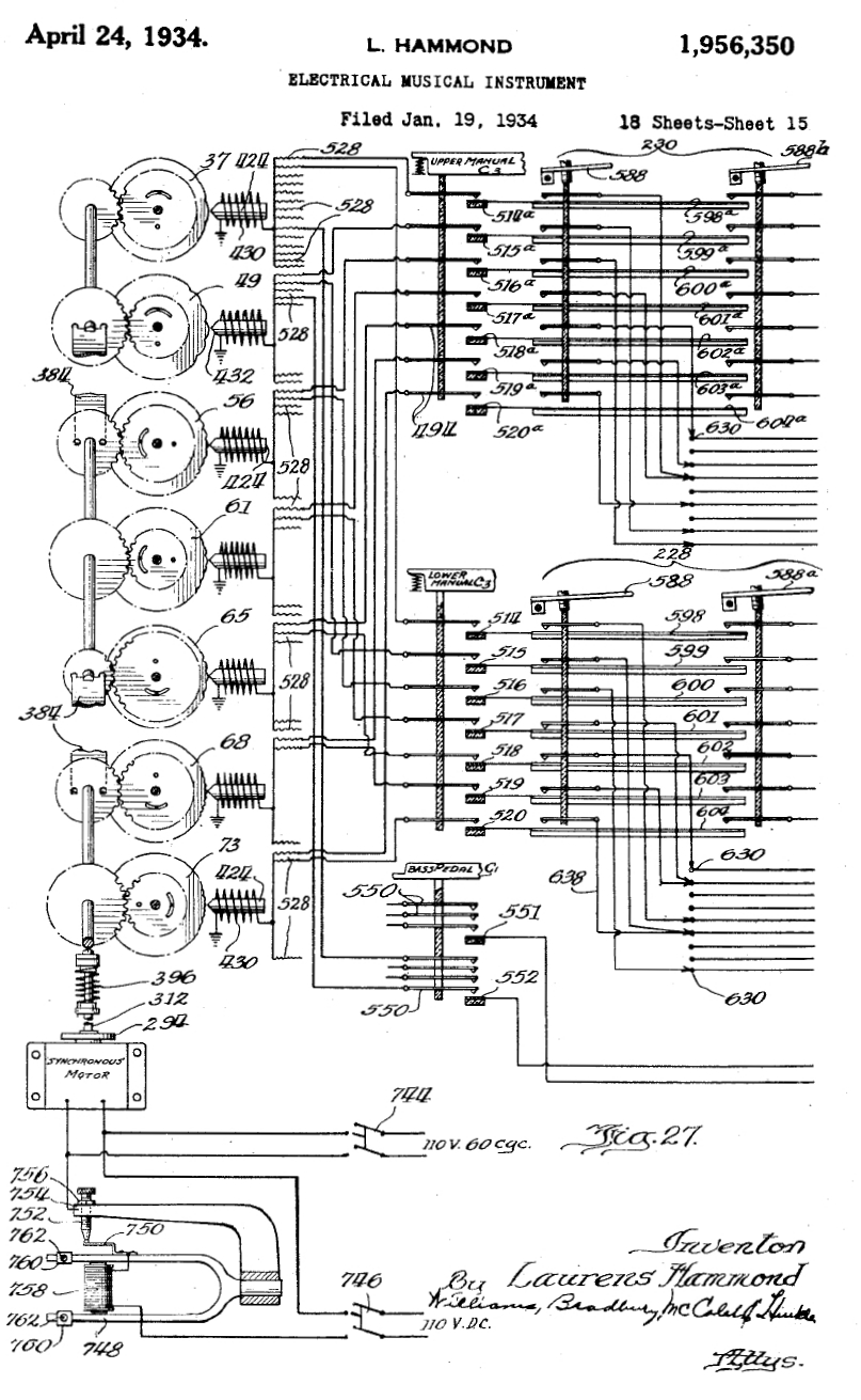 Hieronder vindt u het unieke historische document, waarmee Laurens Hammond het ontwerp, de werking en de onderdelen van zijn orgel op 19 januari 1934 inleverde bij het Amerikaanse patent bureau.