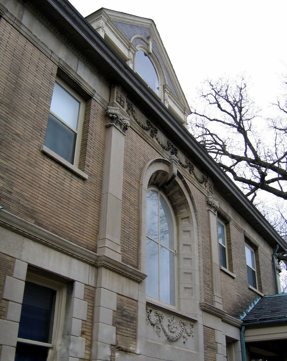 It is constructed of buff-colored Roman brick with stone trim.