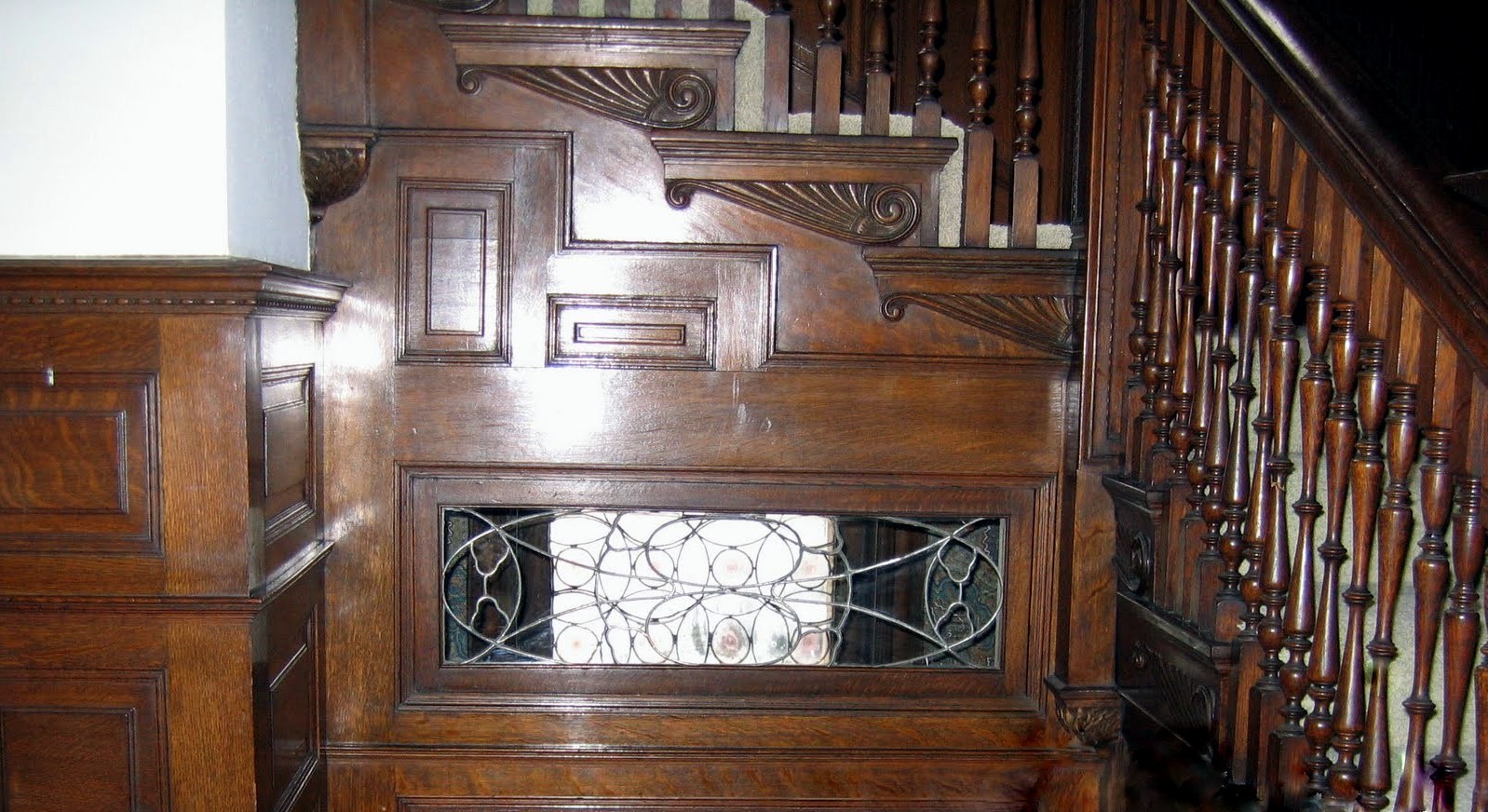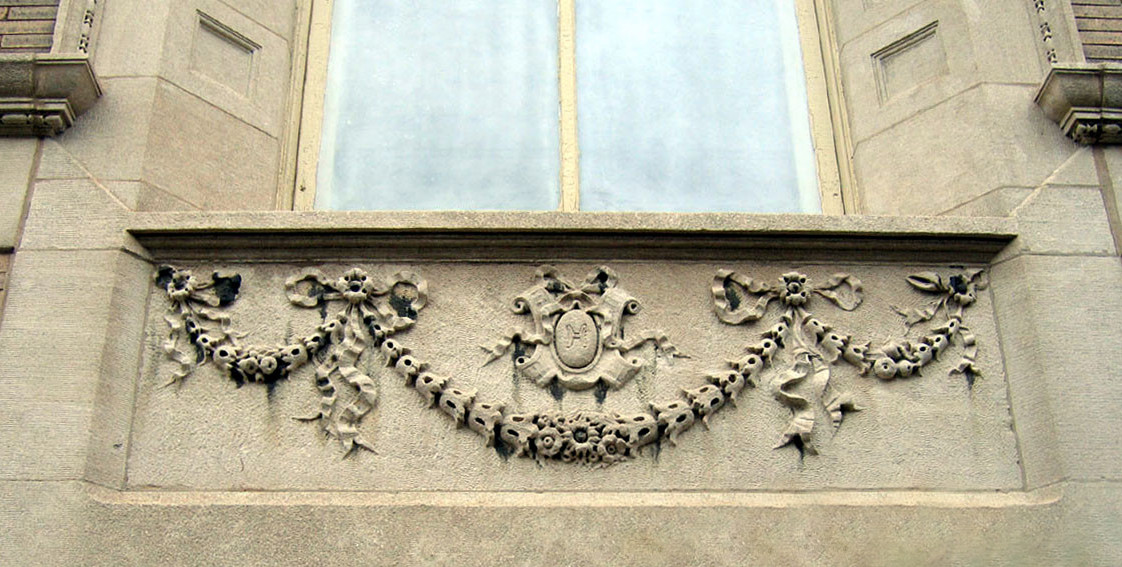 Large festoons at the side entry, beneath the large stair landing window frame a cartouche bearing the letter "H" :