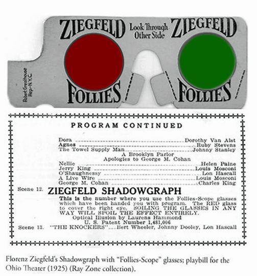 Daartoe verzon Hammond een soort schaduwspel: de rechts/links knipperende projectoren gooiden hun licht op het lege projectiescherm en daarachter bevonden zich danseressen. Doordat de brilletjes en de synchromotoren doordraaiden, verdubbelde het aantal danseressen.