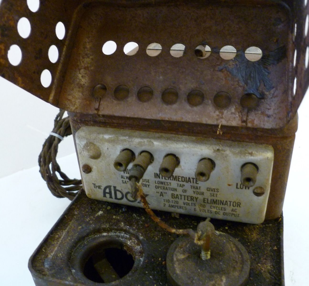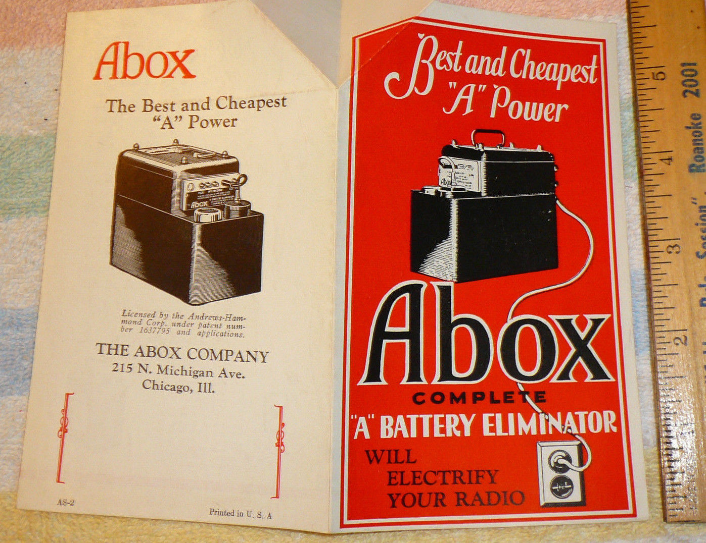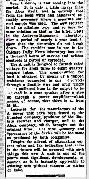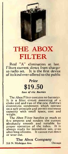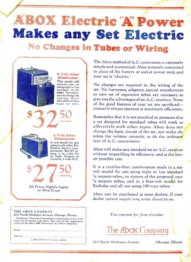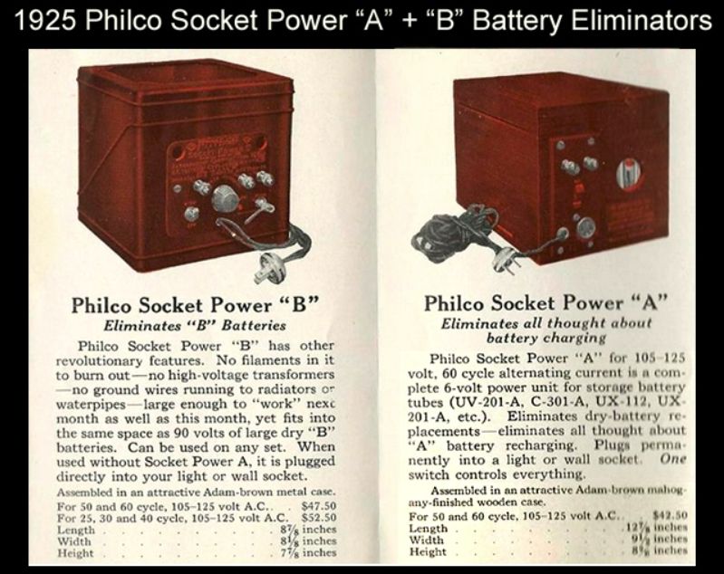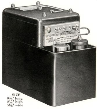 De A-Box, aangesloten op een stopcontact had twee units van zes volt waar een radio op kon draaien, in plaats van op een accu, die je steeds buiten de deur op verschillende plaatsen op kon laden.